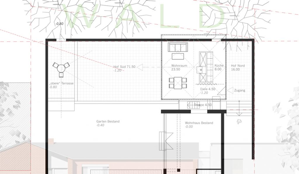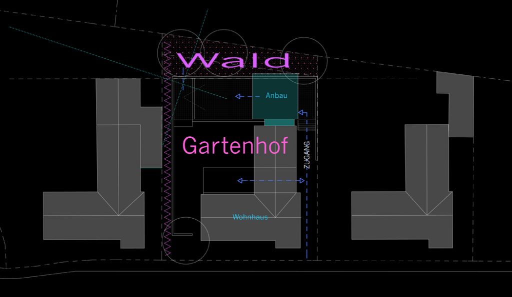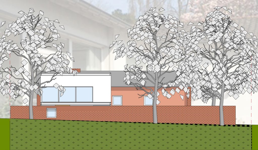 Bei dem Bauvorhaben handelt es sich um die Erweiterung eines erdgeschossigen Wohnhauses (Bungalow) in einer heterogen Siedlungsstruktur in Aachen Laurensberg. Die Erweiterung wurde im rückwärtigem Gartenbereich entwickelt, so dass die vorhandene „Bungalowarchitektur“ für das gesamte Siedlungsbild erhalten bleiben würde. Der Anbau , ein 2-geschossiger Stahlbau, kann ebenso als ein eigenständiges „Tiny House“ genutzt werden.