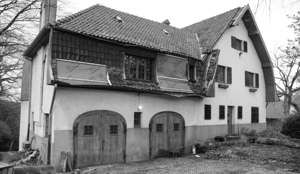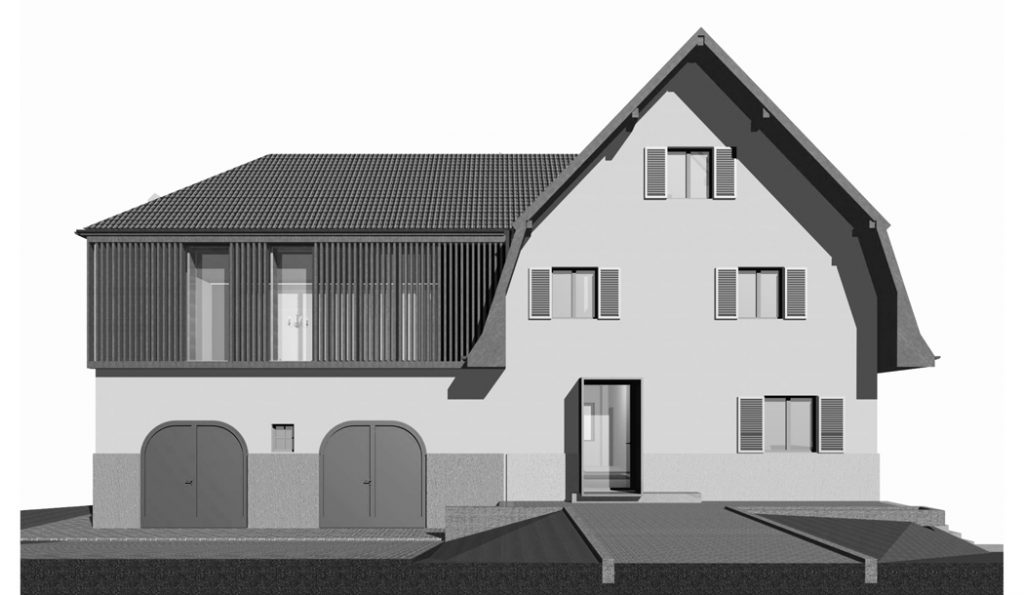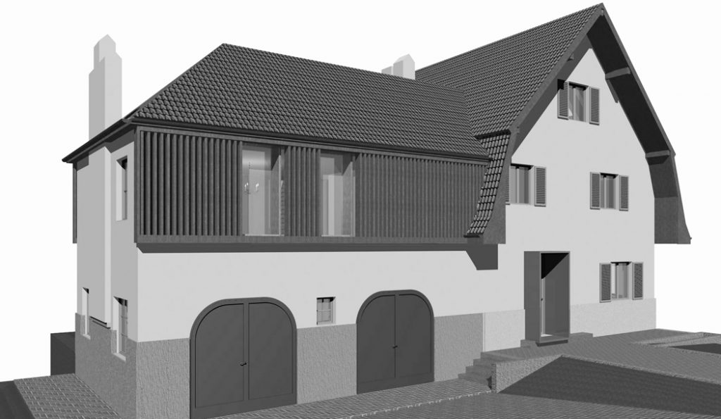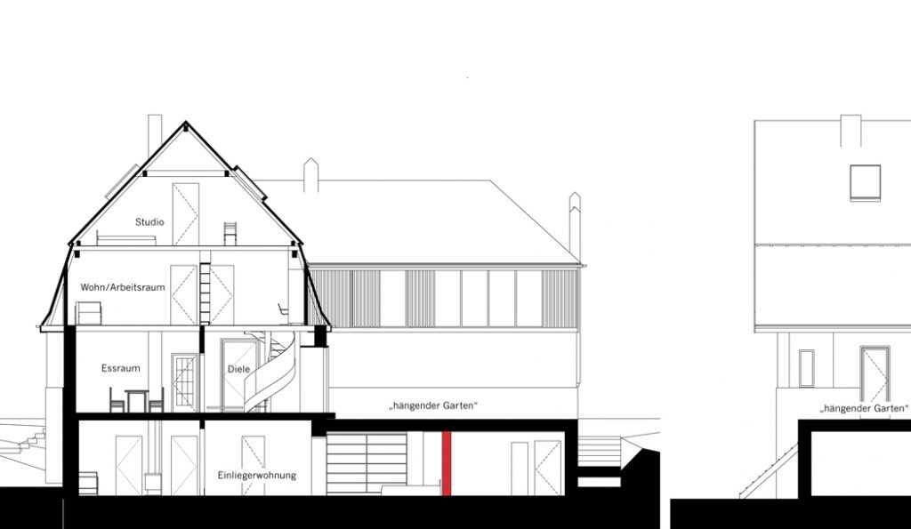 Das Wohnhaus wird reduziert auf das Haupthaus und dem wenige Jahre später hinzugefügten Anbau. Was vordem nur eine Ansammlung von Anbauten und Baustilen war, wird durch die Reduktion zum Ensemble und stellt die Wertigkeit zwischen Haupthaus und Anbau her.