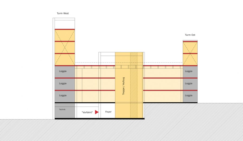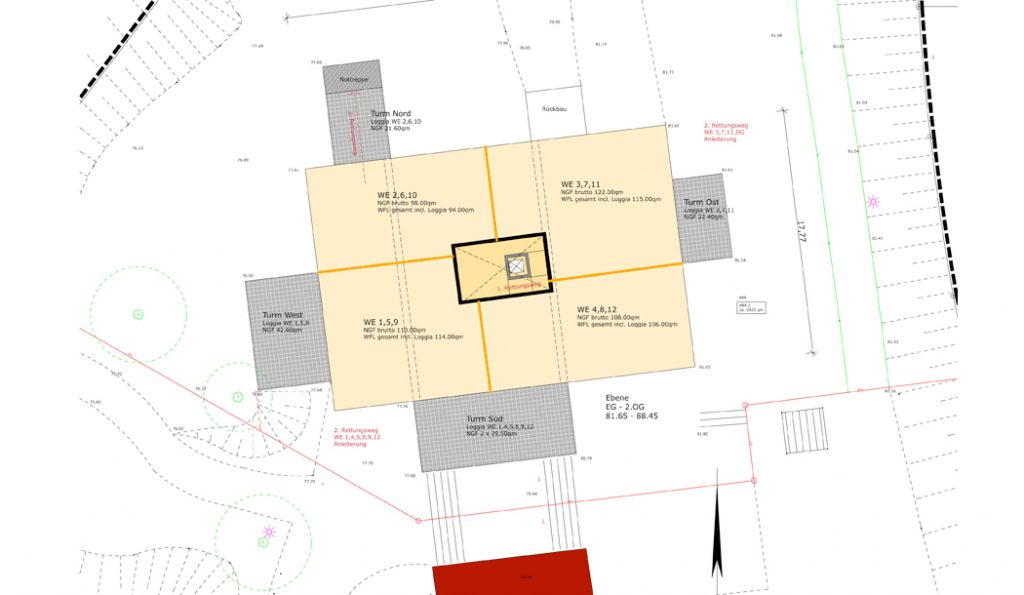 Geplant sind 15 Wohneinheiten incl. Nutzung der Türme. 3 Wohnebenen mit jeweils 4 Wohnungen werden in dem ehemaligen „Kirchenraum“ entstehen können. Zentral angeordnet wird das Treppenhaus mit einem Aufzug bis auf die Dachebene.  Die Türme in den „Wohnebenen“ werden genutzt als Außenfläche (Loggia) für die jeweiligen Wohnungen. Von der Dachebene erschließen sich 3 separate Wohnhäuser (Tiny-Houses) in den Türmen oberhalb der Dachebene. Das Hanggeschoß beinhaltet das „Foyer“ Technikräume und notwendige Abstellräume. Erschlossen wird das Gebäude dann ausschließlich von Süd-Westen von der Straße Am Buschgarten.