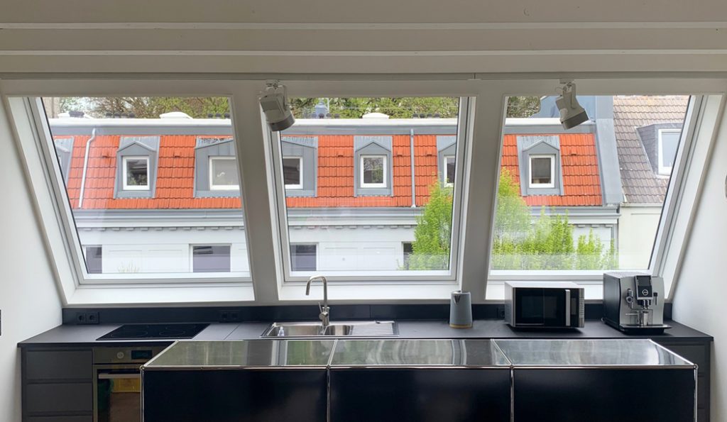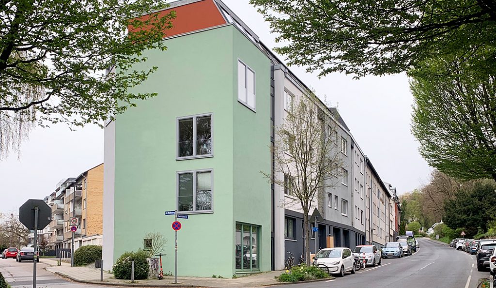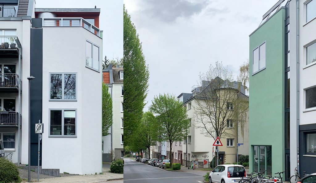 Auf einem 6.00 Meter schmalen und 55 qm kleinem Grundstück, an einer Brandwand ,anlehnend“, finden über 240 qm Nutzfläche Platz, in Form von 2 Wohn/Büroetagen und einem 2-geschossigen Penthouse mit grosszügiger Dachterrasse.